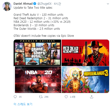 “Update to Take Two title sales: Grand Theft Auto V - 130 million units Red Dead Redemption 2 - 31 million units NBA 2K20 - 12 million units (+33% vs 2K19) Borderlands 3 - 10 million units The Outer Worlds - 2.5 million units GTAV doesn't include free co