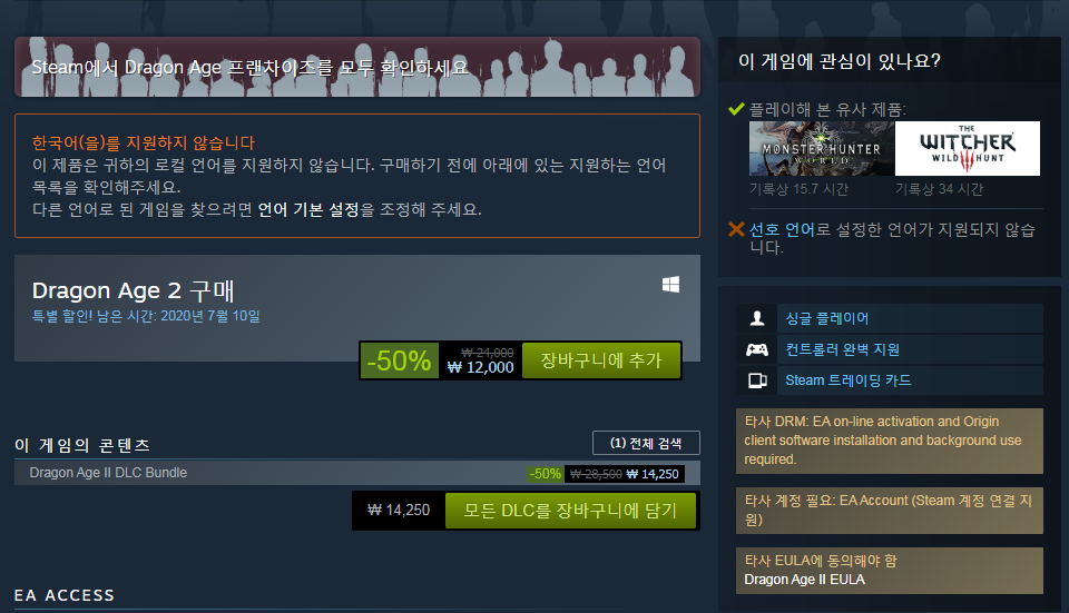 그외에 Dragon Age: Origins, Origins The Awakening, 2 DLC Bundle도 50퍼센트 할인하고 있습니다