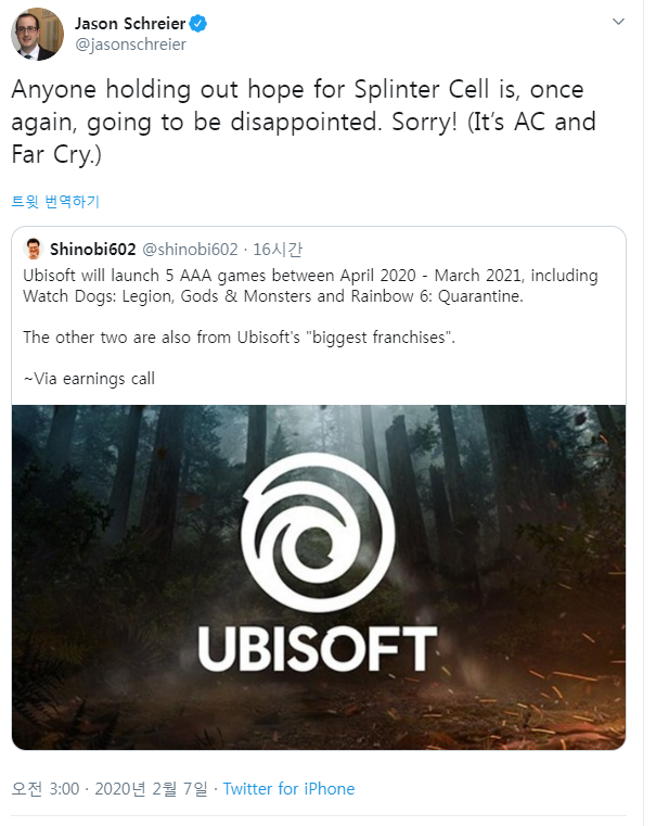 “Anyone holding out hope for Splinter Cell is, once again, going to be disappointed. Sorry! (It’s AC and Far Cry.) https://t.co/7hKDV3y5QS”