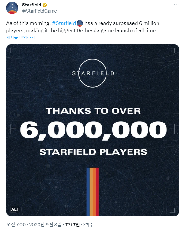 As of this morning, #Starfield has already surpassed 6 million players, making it the biggest Bethesda game launch of all time.